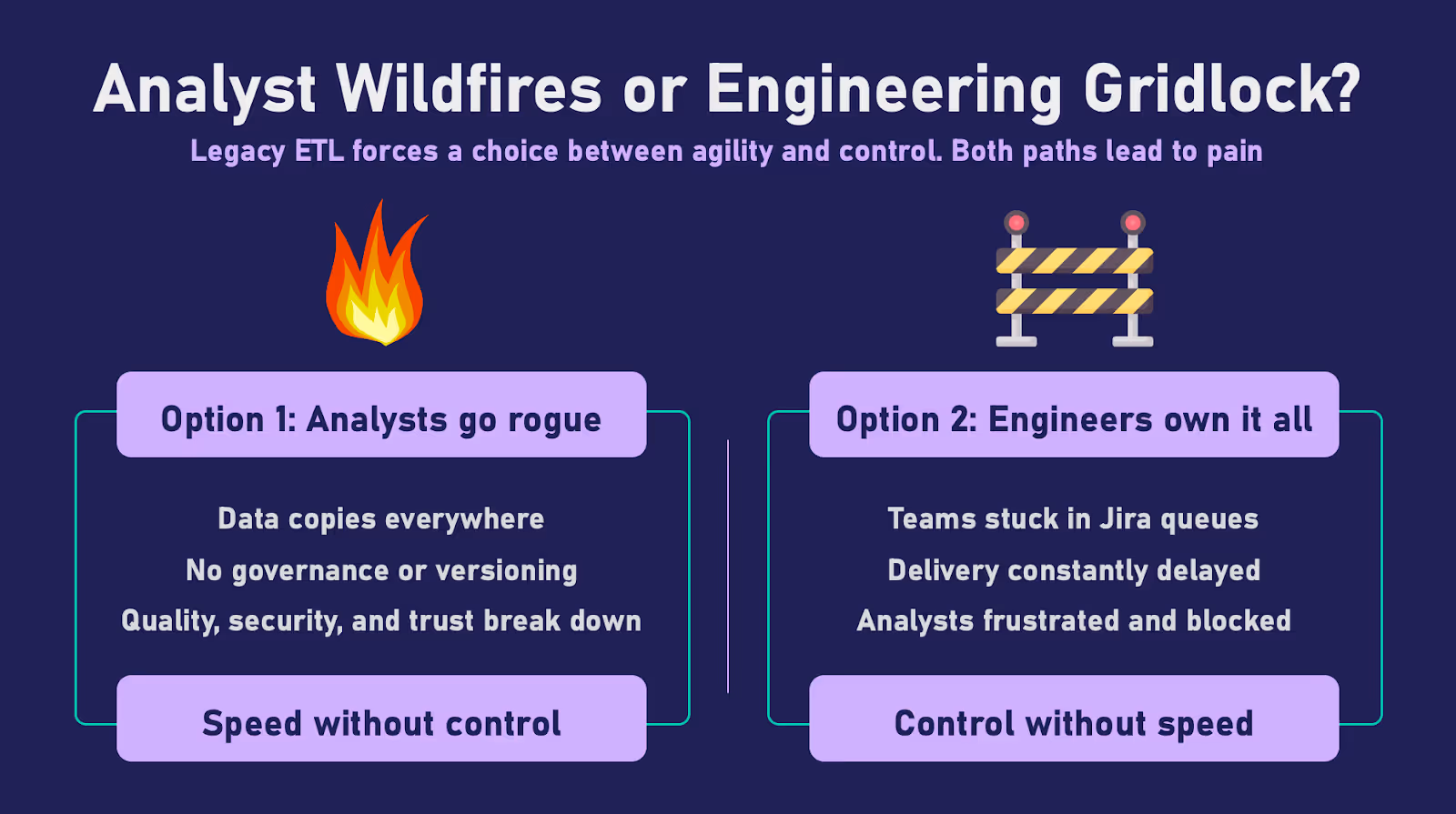 - Analysts moving fast, but creating BI-driven wildfires and shadow pipelines with zero version control
